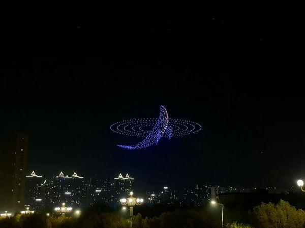 19點(diǎn),無人機(jī)編隊(duì)表演拉開序幕。千架無人機(jī)如星河般升空,在夜空中排列出 “千年儒鄉(xiāng) 一湖靈秀”、“我愛衡水”、中國(guó)龍、鳳凰、藍(lán)鯨等多種圖案,將冀興臻園與城市共進(jìn)、共建理想家園的美好遠(yuǎn)景集中呈現(xiàn)。