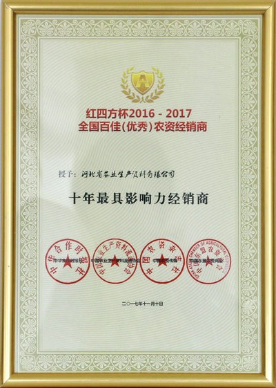 公司榮獲全國百佳(優(yōu)秀)農(nóng)資經(jīng)銷商 “十年最具影響力經(jīng)銷商”稱號(hào)