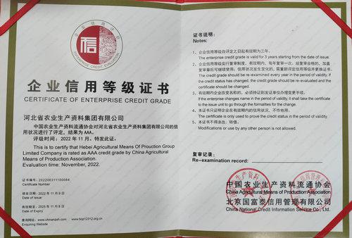 本網訊 近日,中國農資流通協(xié)會發(fā)布2022年度中國農資流通行業(yè)企業(yè)信用等級評價結果,河北省農資集團公司再度獲評企業(yè)信用等級AAA級,屬于行業(yè)信用評價最高等級。