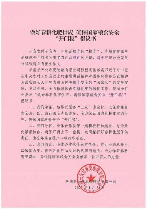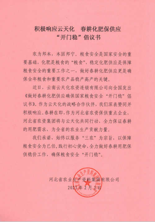 近日,云南云天化農(nóng)資連鎖有限公司向全國(guó)發(fā)出《做好春耕化肥供應(yīng)確保國(guó)家糧食安全“開(kāi)門(mén)穩(wěn)”倡議書(shū)》。作為云天化的戰(zhàn)略合作伙伴,我們深表贊同并積極響應(yīng)。春耕在即,作為河北省農(nóng)資保供重點(diǎn)企業(yè),河北省農(nóng)資集團(tuán)將與云天化共同行動(dòng),全力保證春耕的用肥需求,為全省的農(nóng)業(yè)生產(chǎn)貢獻(xiàn)力量。