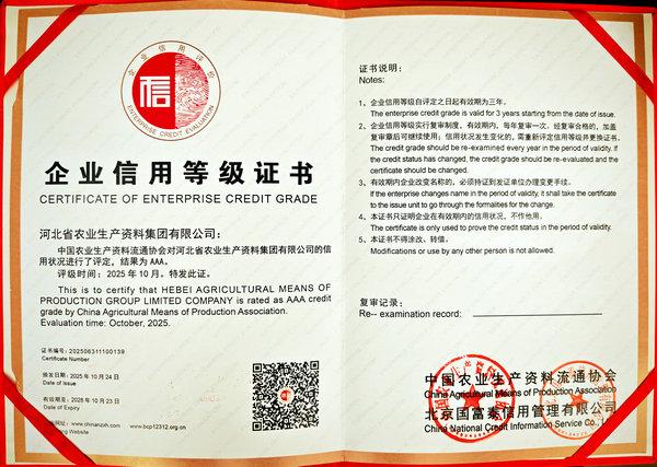本網(wǎng)訊 11月4日,中國農(nóng)業(yè)生產(chǎn)資料流通協(xié)會在江蘇省南京市召開“2025年度中國農(nóng)資經(jīng)銷商年會”。會上發(fā)布了“2024/2025中國農(nóng)資流通行業(yè)發(fā)展報告”,公布了2025年度中國農(nóng)資流通企業(yè)信用等級評價結(jié)果、2025年度農(nóng)資流通企業(yè)競爭力評價及農(nóng)資行業(yè)知名品牌認(rèn)定結(jié)果。集團公司被評為“AAA級信用企業(yè)”,同時榮獲“2025年度農(nóng)資流通企業(yè)競爭力AAAA級”,“冀農(nóng)”品牌被評為‘“AAA”級農(nóng)資行業(yè)知名品牌(產(chǎn)品類)。
